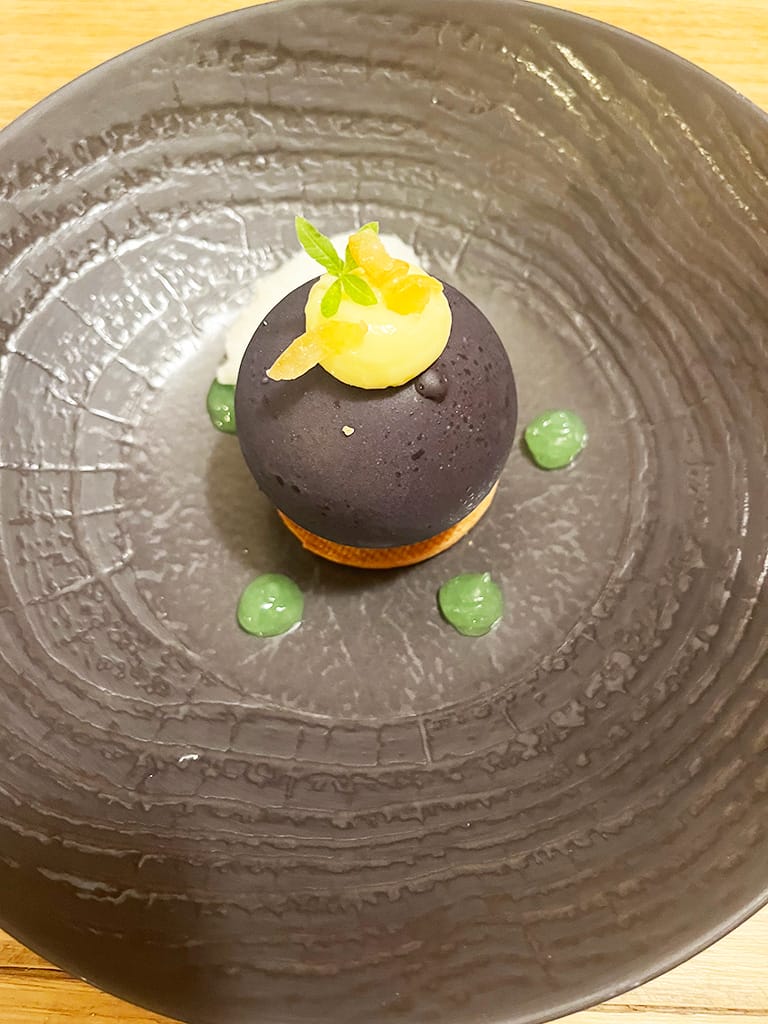 Peter and I worked our way through the Gourmand menu, which offered two choices at each course. We both chose different dishes and by sharing managed to enjoy a little taste of everything. Food envy didn’t kick in until dessert. I chose La sphere de citroen noiz d Iran which translates to The Black Lemon Ball of Iran. Despite its name, it was delicious.